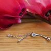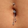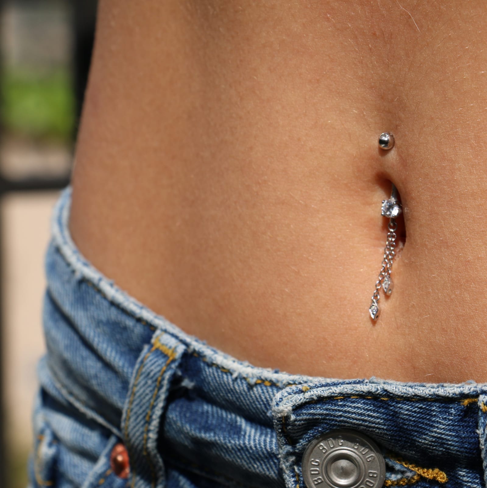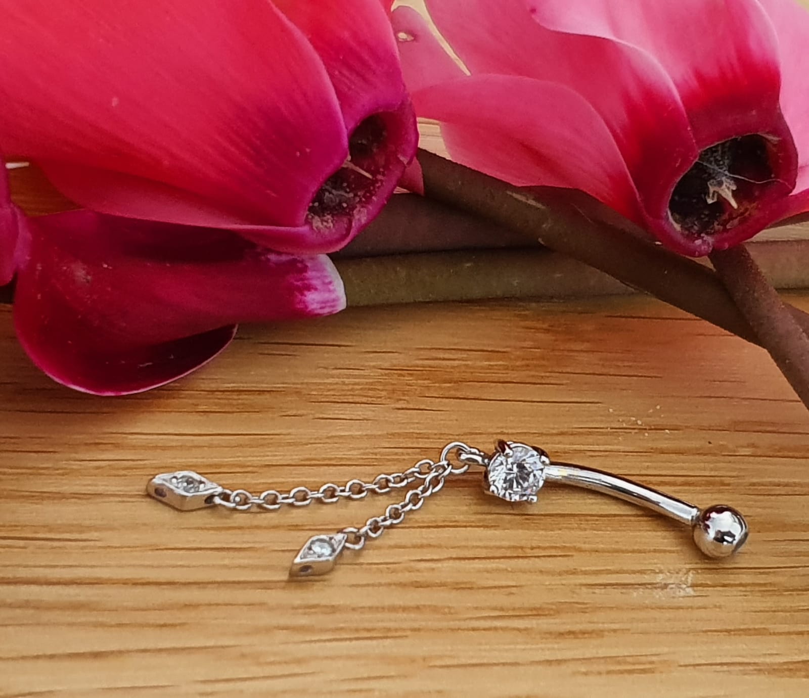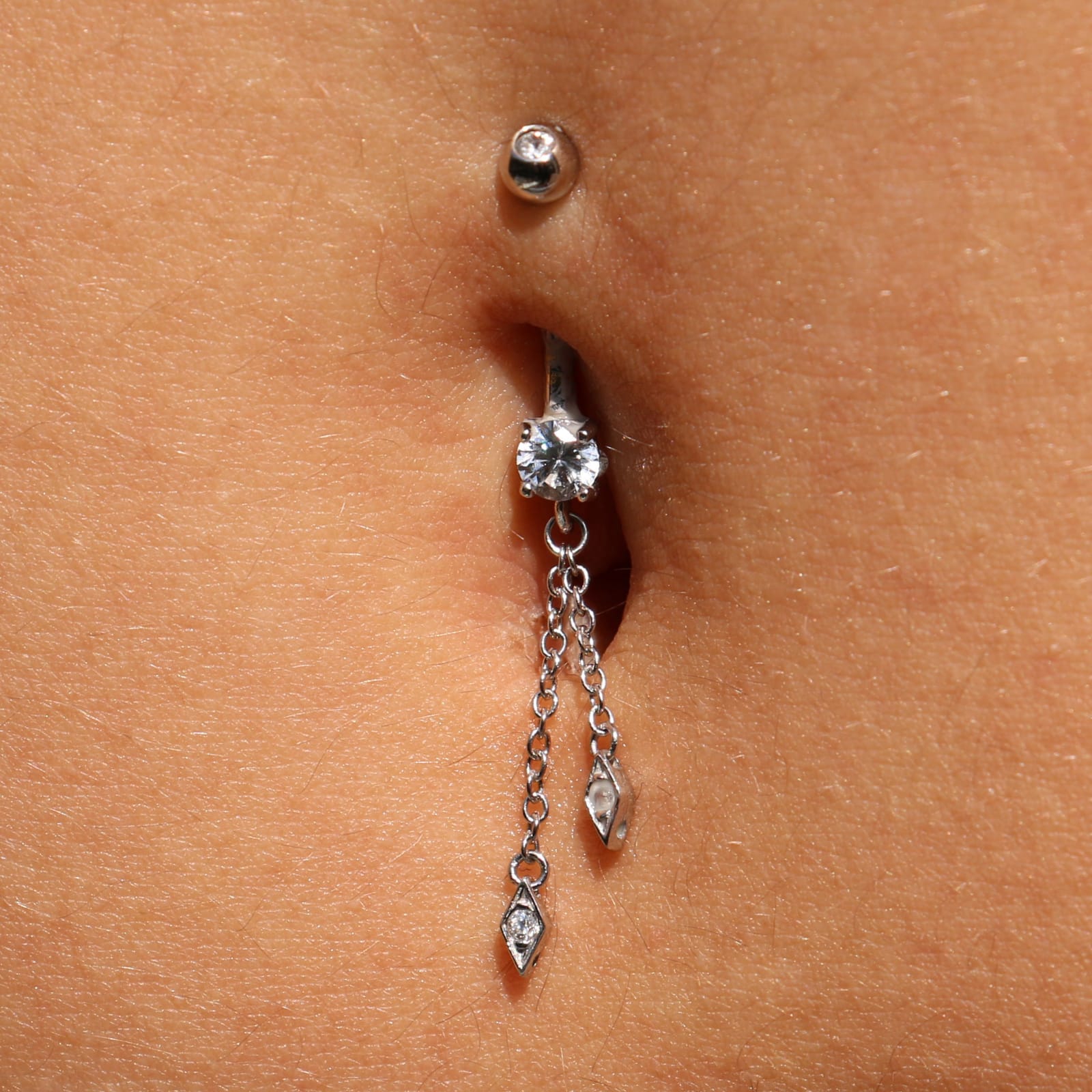 עגיל לטבור מזהב לבן – זירקוניה עגול לבן ושתי שרשראות ומרקיזים עם קריסטלים לבנים