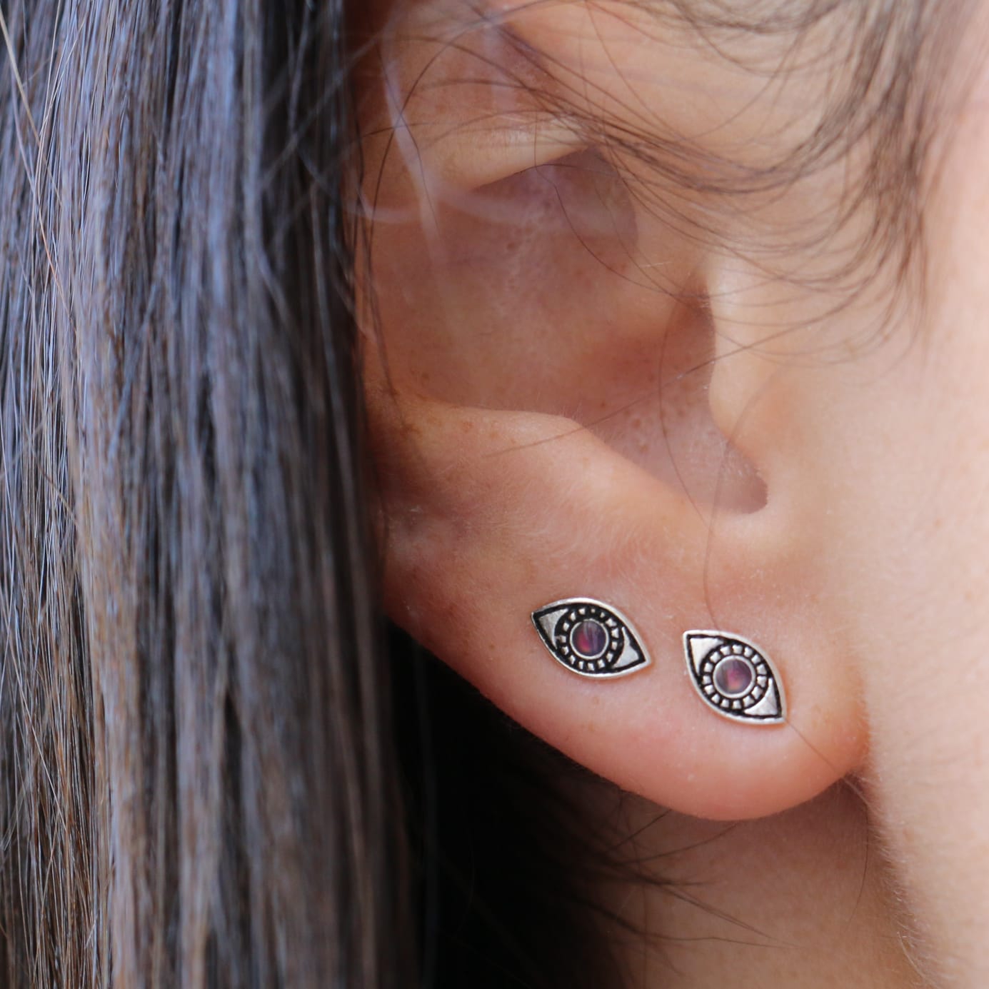 עגילים צמודים מכסף – עין עם אבן מחליפה צבעים