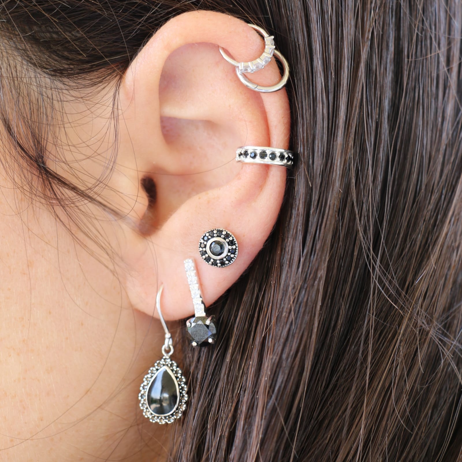 עגילים צמודים מכסף שיבוץ פבה עיגול שחור ושורת קריסטלים לבנים