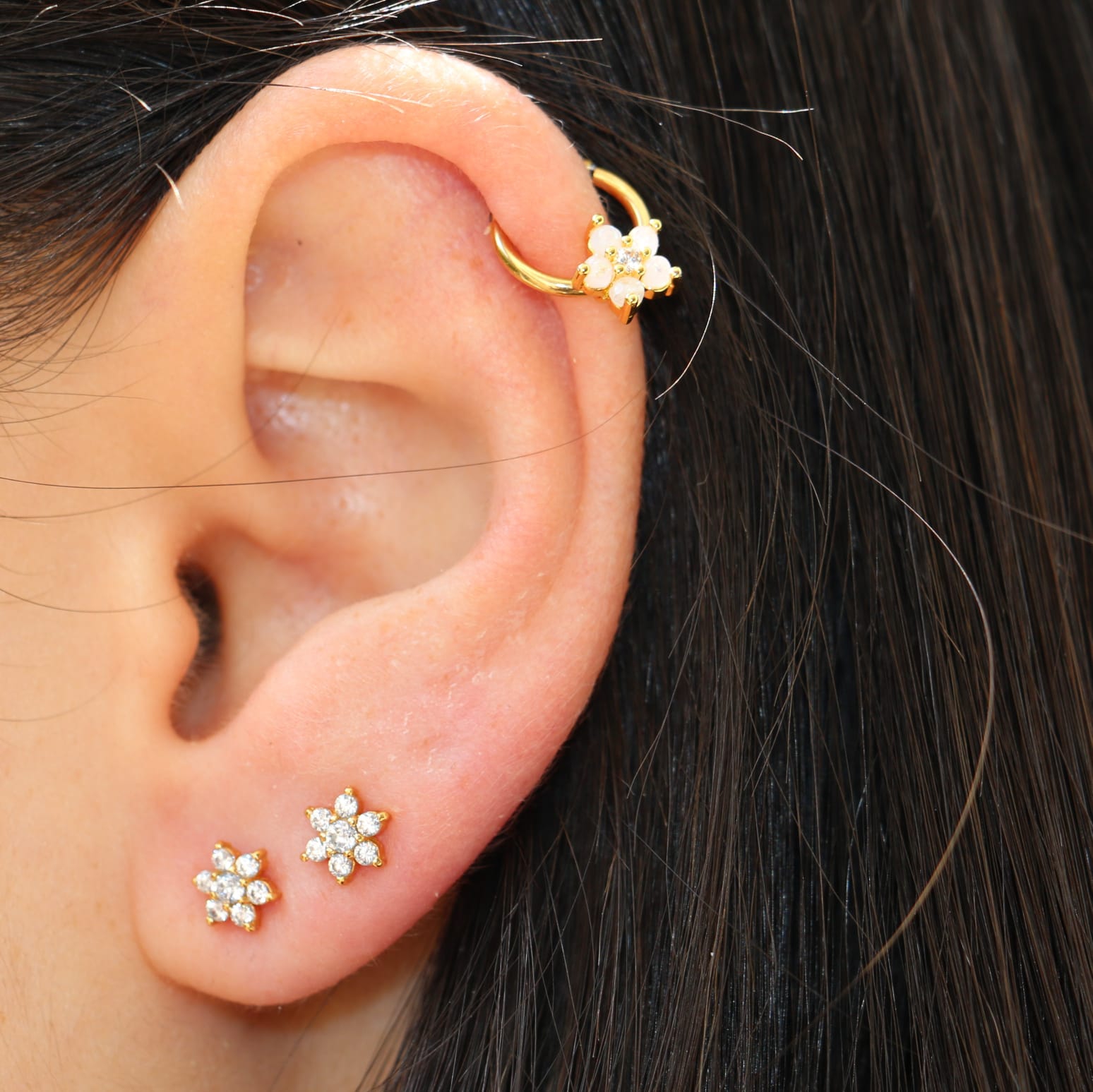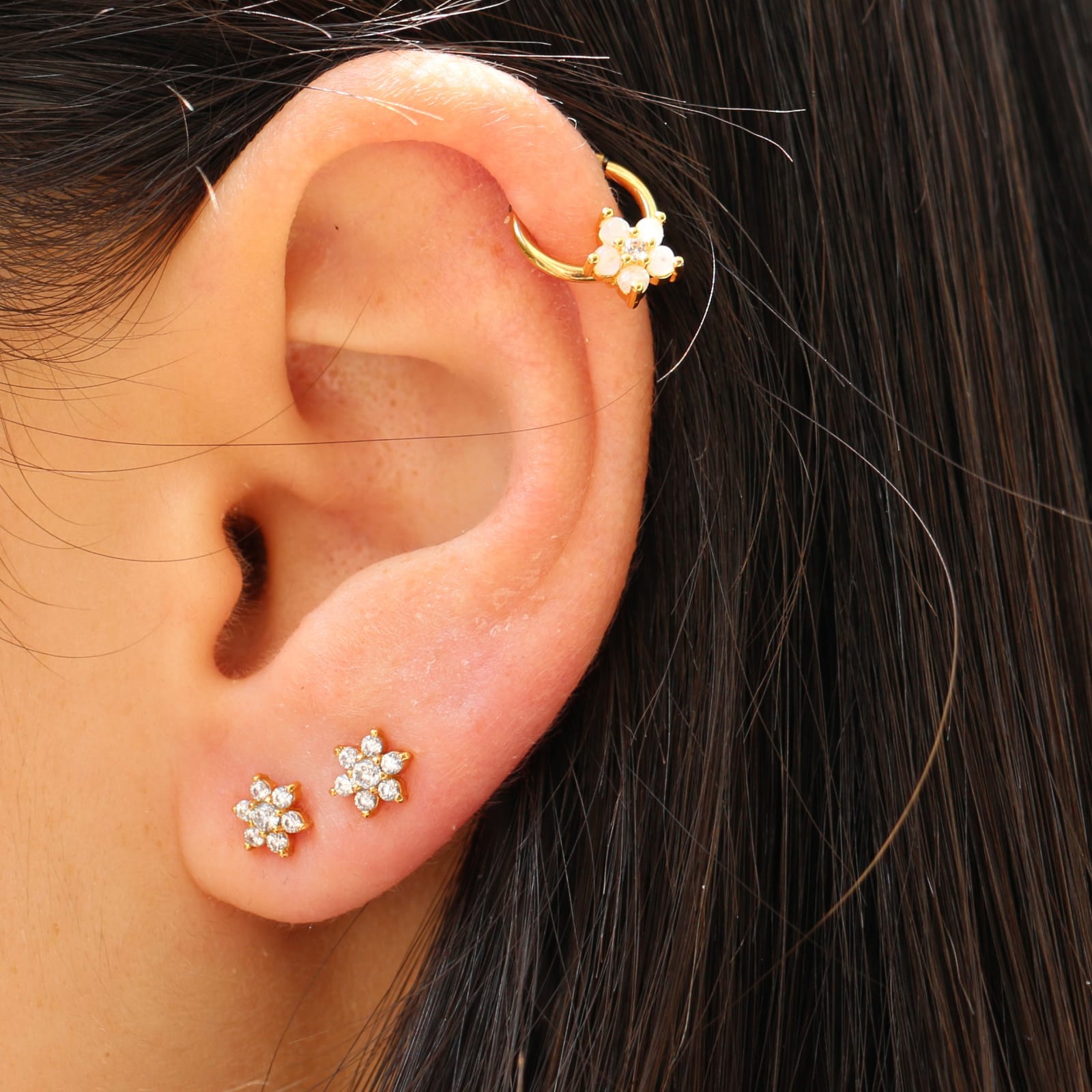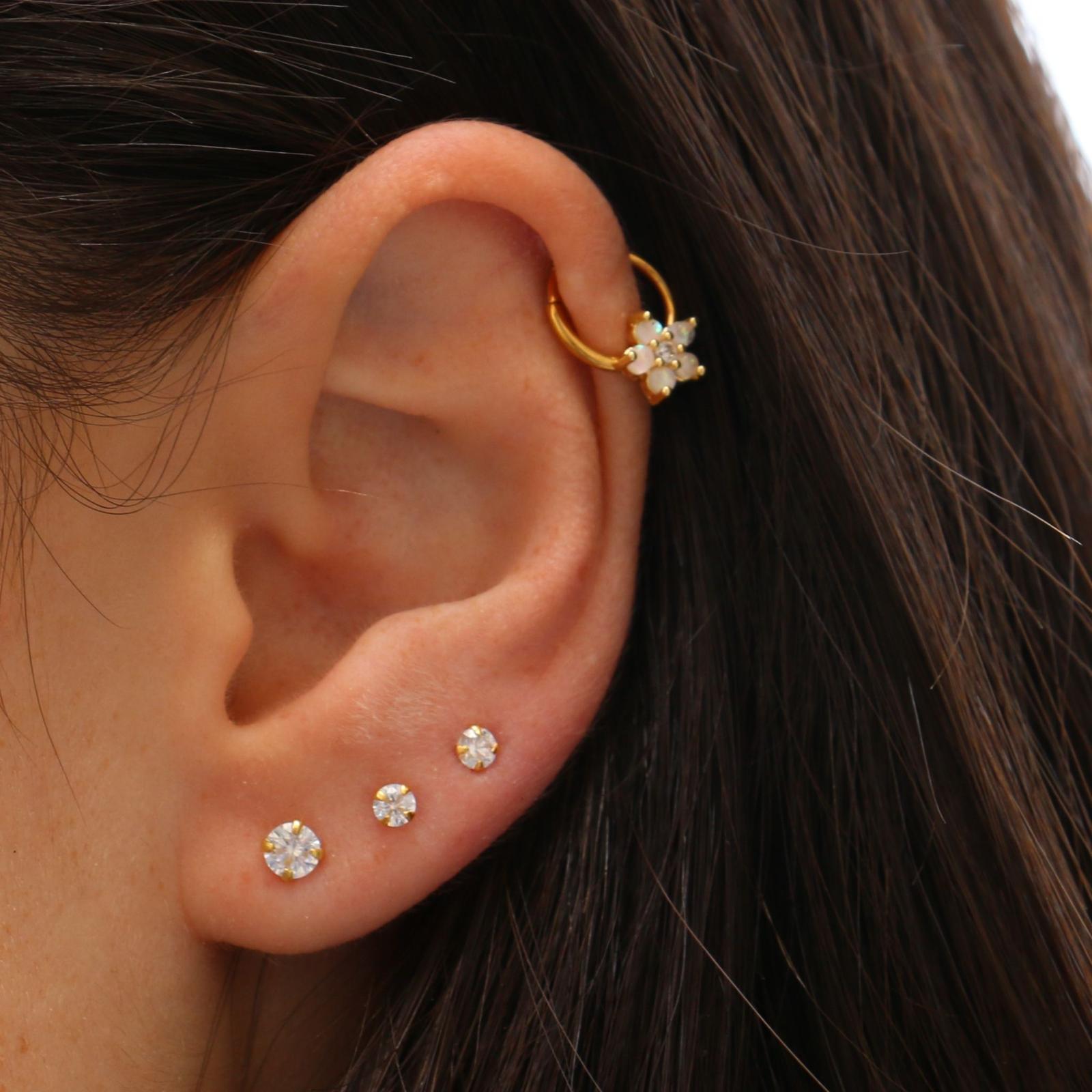 עגיל פירסינג הליקס מציפוי זהב – קליקר פרח אופלים לבנים