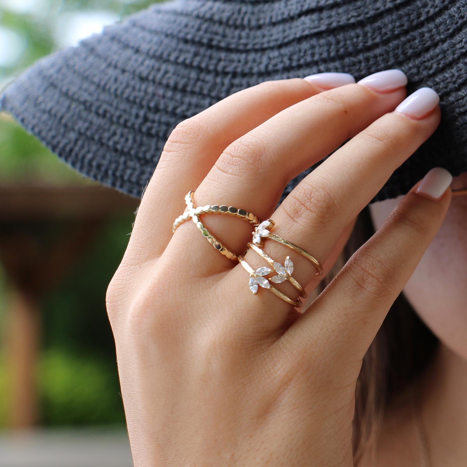 טבעת מכסף וציפוי זהב – עלים וקריסטלים לבנים