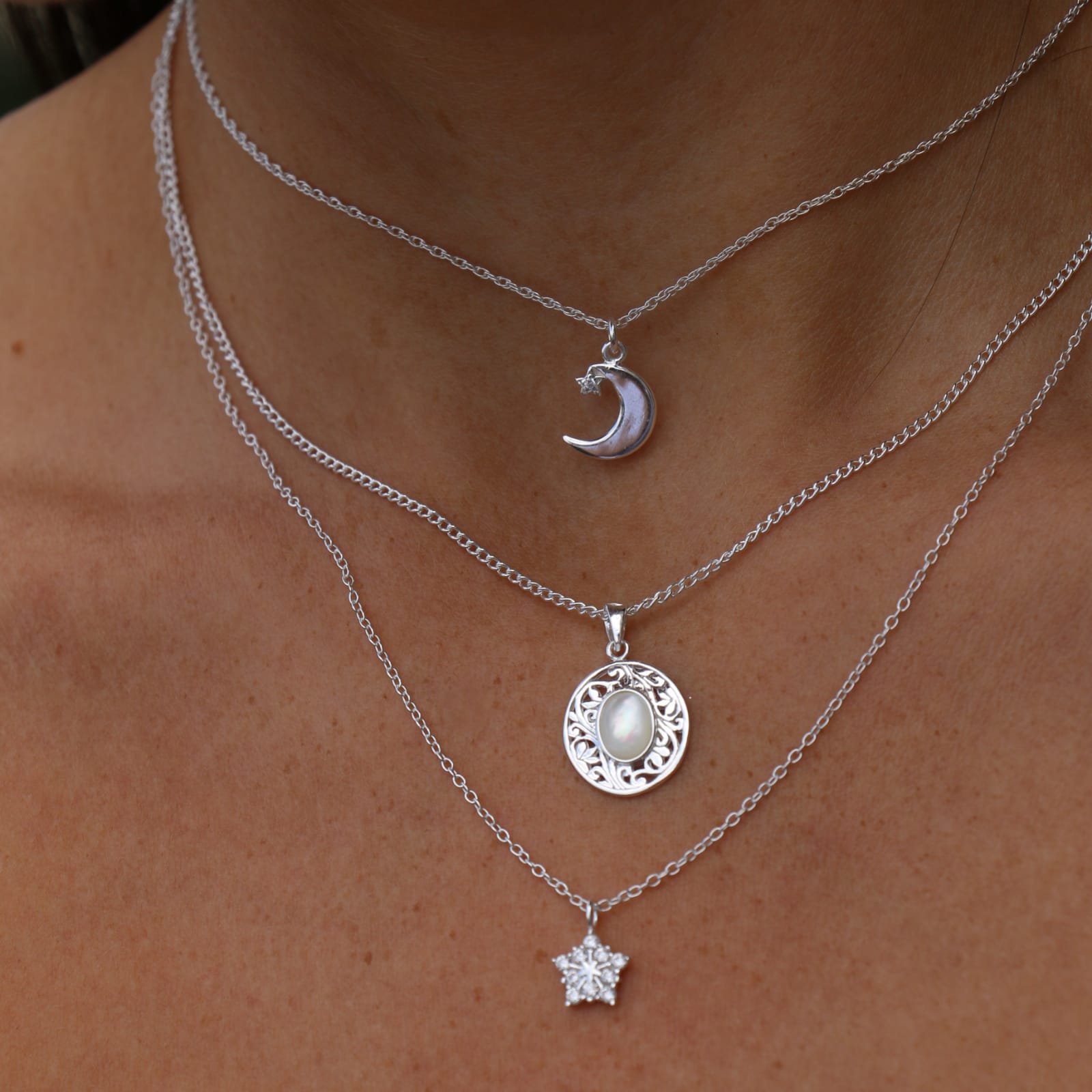 שרשרת מכסף צ'וקר – ירח כוכב וקריסטל לבן