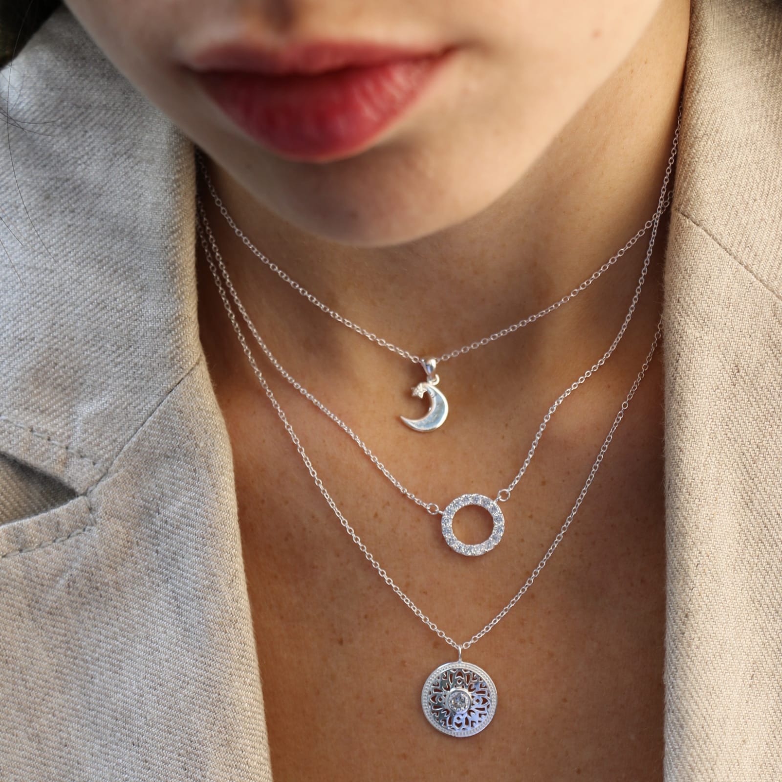 שרשרת מכסף – מנדלה עגולה עם קריסטל לבן