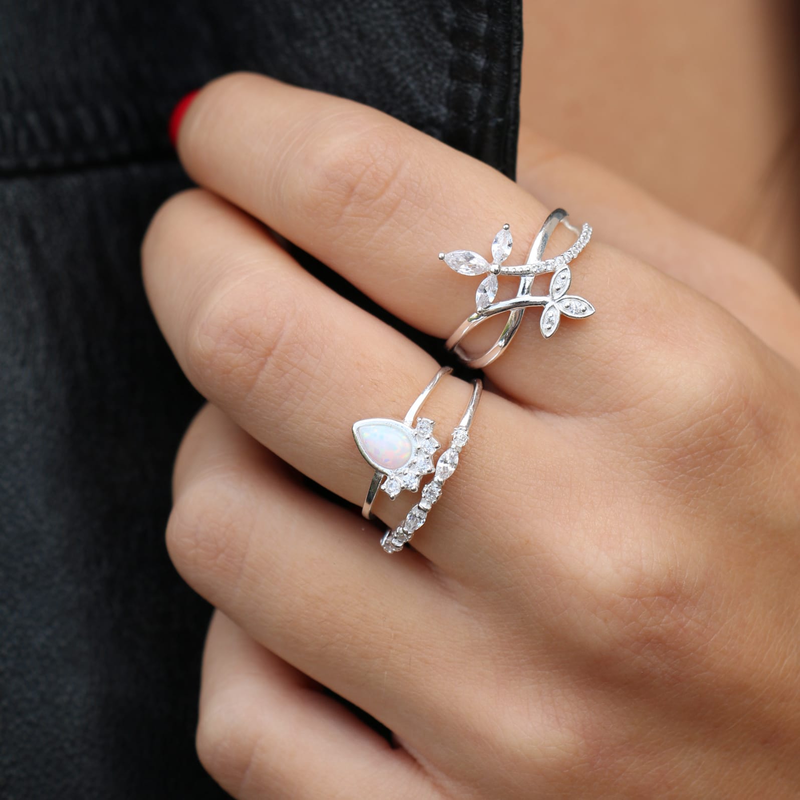 טבעת מכסף טיפה של אבן אש לבנה עם קריסטלים לבנים