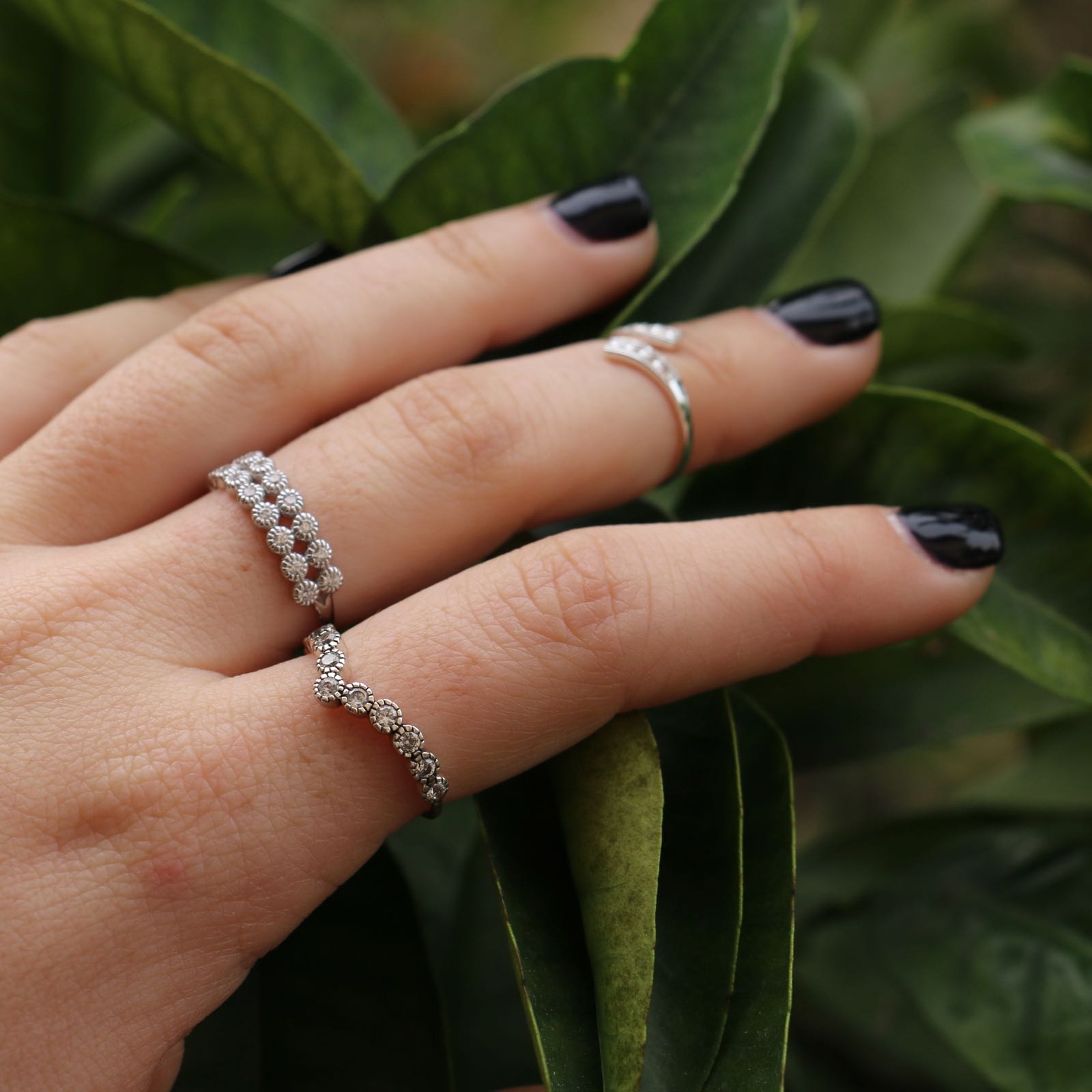 טבעת מכסף חצי לב וקריסטלים לבנים