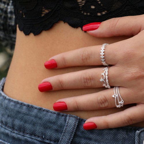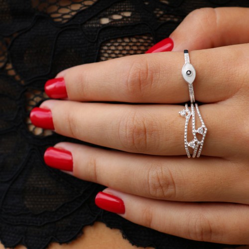 טבעת מכסף – פסי נקודות וקריסטלים לבנים משובצים